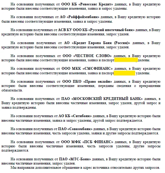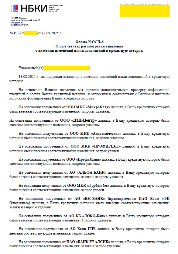 Мы четко указали на каждую неверную запись и потребовали ее исправления в установленный законом срок. Взяв на себя всю коммуникацию, мы шаг за шагом проконтролировали, чтобы БКИ внесло все необходимые изменения по каждому из пунктов.