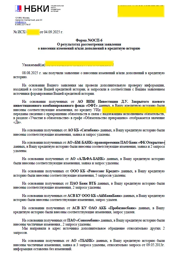 Благодаря нашей настойчивой работе Бюро кредитных историй провело проверку и удовлетворило наши требования. Записи о незаконных заявках были полностью удалены из отчета, а кредиту от АО «ВИМ Инвестиции» был присвоен верный статус «Закрыт».