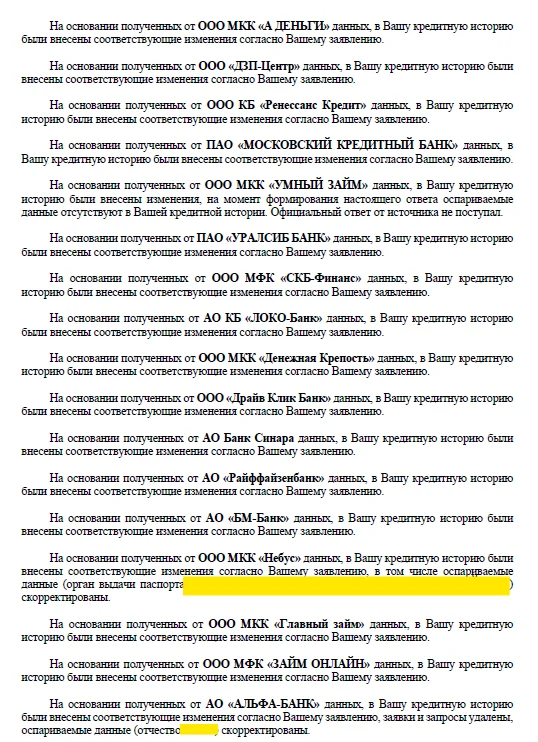 В документе мы не просили, а на основании ФЗ-218 «О кредитных историях» требовали провести проверку и привести данные в полное соответствие с официальными документами. Мы полностью взяли на себя всю коммуникацию с БКИ, чтобы гарантировать, что исправления будут внесены корректно и в полном объеме.